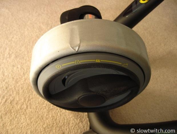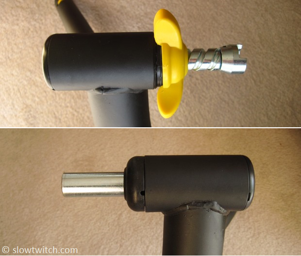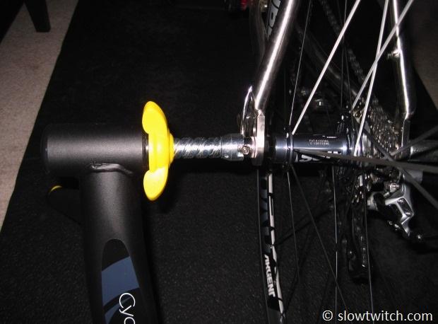 It is worth noting that while the bike is secure in the trainer, there is some measure of flex in the system. I don’t know if it is intentional or not, but the net effect is that the bike will sway slightly side-to-side as you pedal. The silver pieces that hold the skewer (above) will flex up and down somewhat. If may feel disconcerting if you’re used to a dead-solid trainer, but you could also argue that it feels more realistic. To me, it’s a shoulder-shrug issue.