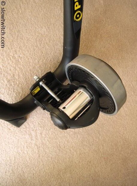 My SuperMagneto Pro has a plastic lever that adjusts the roller. You lift it up to bring the roller to your tire. To make large adjustments (e.g. move the roller a farther distance to accommodate a different size wheel), you must turn the lever 90 degrees – and then move the resistance unit manually.