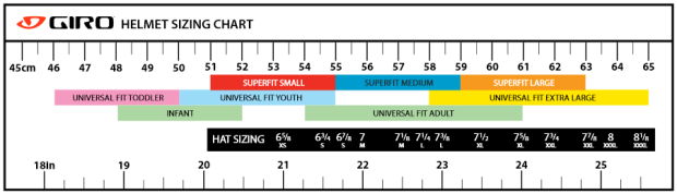 The Air Attack follows the same sizing system as Giro’s other top road helmets – called ‘Superfit’ in the chart below: