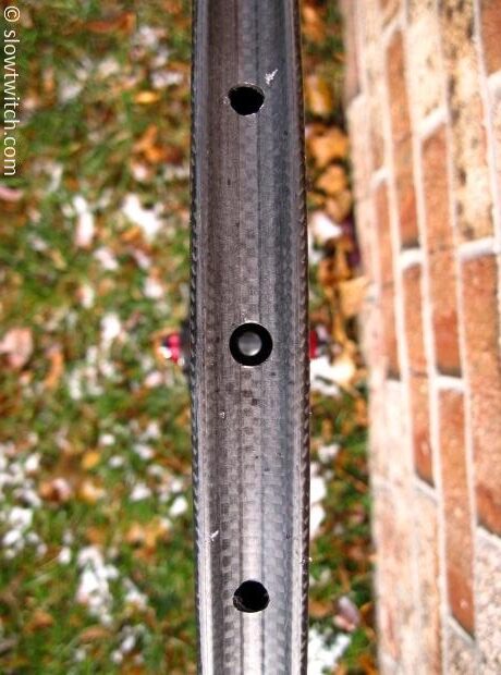 Those unfamiliar with tubular wheels might not think of this detail, but it is important: Valve hole diameter. The hole drilled in the outer rim wall must be larger than the hole drilled in the inner rim wall. This allows the material built up around the tubular tire valve to sit down in the rim properly, thereby avoiding a bump in the tire. Vision got it right: