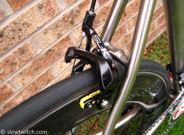 My only complaint with the brakes is that the quick release lever does not open the pads up very far; figure about half of what a SRAM or Shimano caliper will do. Clearance to my front fork was very tight on the left pad – it just cleared: