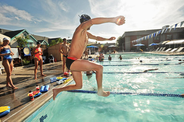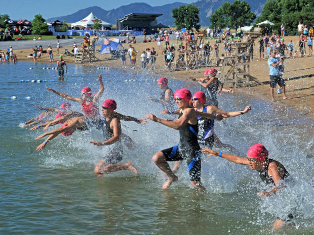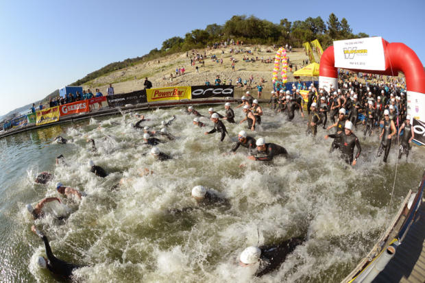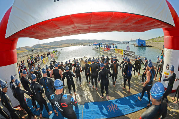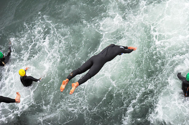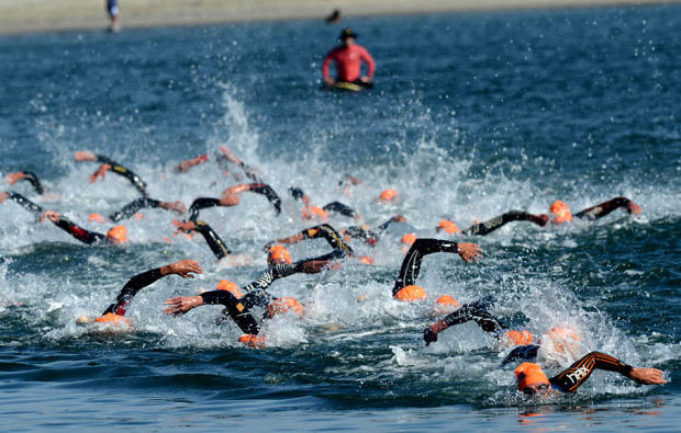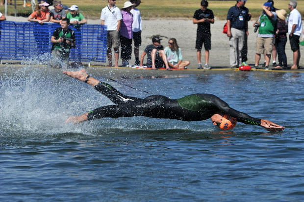 A pro launches into Mission Bay on the second lap of the swim at the $20,000 Super Sprint Triathlon in San Diego.