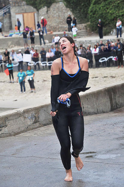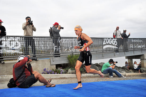 Sarah Groff exits the swim on her way to victory at the Mission Bay Super Sprint Triathlon.
