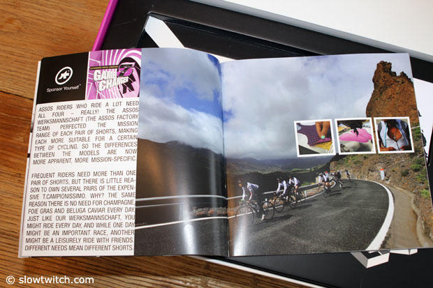 The 11 x 11 color brochure labeled Spyshot S14 explains the concept of the new bib shorts in detail and so does the elaborate DVD.