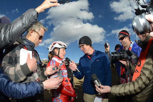 Elle Anderson (#4) of San Francisco finished 2nd and was met with a scrum of reporters and photographers at the finish.