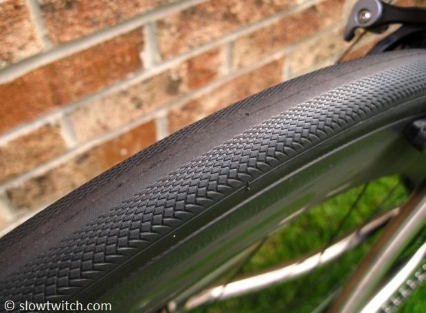 In contrast, rolling resistance is the amount of energy that the tire ‘soaks up’ when it gets deformed on the road surface – and then returns to shape as it leaves the road surface. Many things come in to play here, such as rubber compound, tread thickness, the type and thickness of anti-puncture layer, tire width, and so on. I honestly don’t know if it is possible to have a compound so soft (e.g. with high cornering grip) that it actually sticks to the road like glue and causes an effective increase in rolling resistance. With such a small contact patch on a bicycle tire, I’m guessing that any differences here are very small.