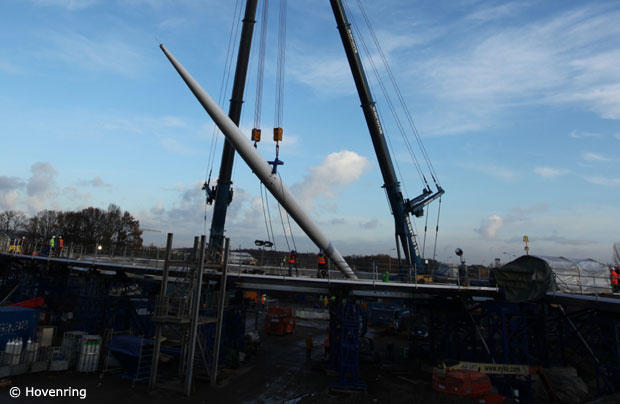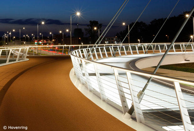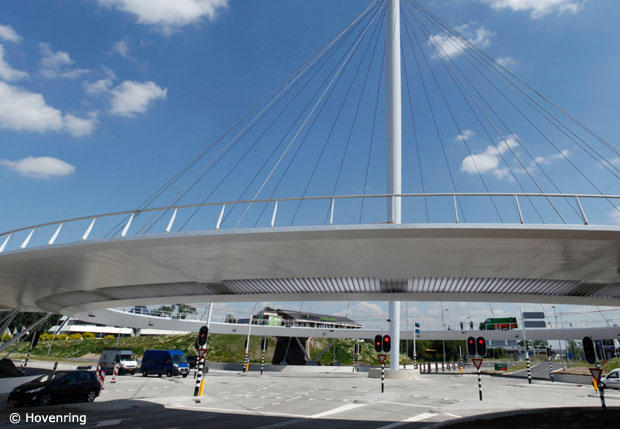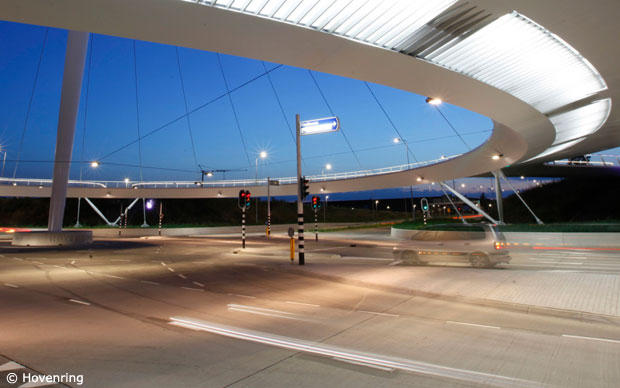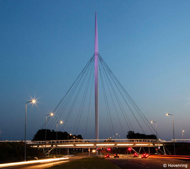 The name Hovenring means rings 'ring of hovens' and connects the Eindhoven, Veldhoven and Meerhoven communities and this beautiful piece of architecture was opened to the public in late June of 2012.