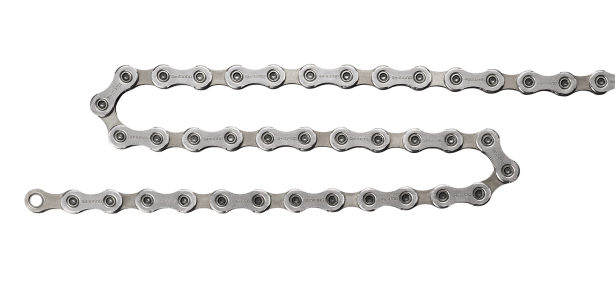 The chain that wraps around our new cassette is called HG600. Shimano has waffled with symmetric and asymmetric chain designs; this one is back to asymmetric: