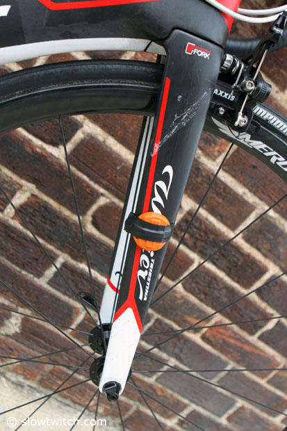 The fork of the Wilier Cento1Air with the distinctive orange timing chip.