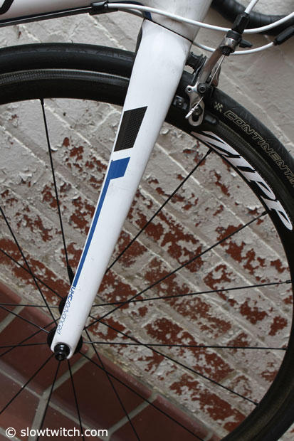 The fork of the Felt F1 with a SRAM Red front brake and a Zipp 202 front wheel.