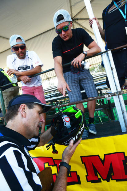 Leon Griffin, who finished second to Jessie Thomas last year, has his European helmet checked by the head referee.