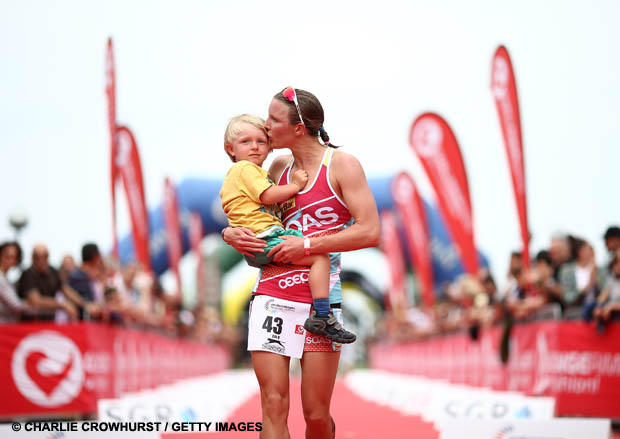 Gina Crawford who finished fourth crossed the line with her son in her arms on this Mother's Day.