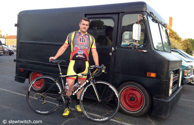 At the recent Tuesday Night Fight in Lewisville, NC I noticed this very cool P10 panel truck and after the ride I realized that it belonged to Travis Beane the owner of the Clemmons Bicycle shop. He bought it a little while ago and changed out the motor and brakes and this vehicle can lift and lower. It will eventually have Clemmons Bicycle graphics on it, but I actually liked it just as was. Apparently though I am not the only one, Beane has gotten several offers to sell it. Clemmons Bicycle sells Cervelo, Scott, Felt among other brands and is a Retul certified fitting shop.