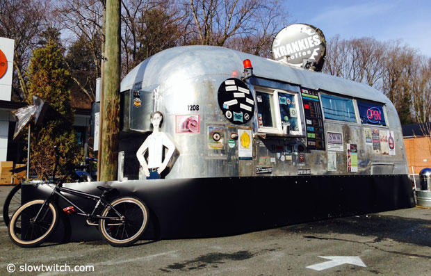 Cyclists love coffee but it is sometime a tricky thing to leave your $10,000 outside while you wait for an espresso or a latte. At the Krankies Coffee shop on the Reynolda Road in Winston-Salem, NC you can roll up with your bike to the window of this cool Airstream and get what you want without having to leave your bike exposed to possible bike thieves. And it seems all the guys who work there ride bikes too, as the bikes parked along the hitch are employee bikes. Krankies also has another location on the other side of town, but that one is an old fashioned brick and mortar place, that often offers music performances and art shows.