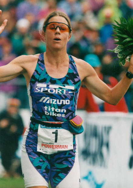 Maddy: The first time I won I can hardly remember. [In 1993, Tormoen finished first in 7:14:49, 69 seconds ahead of Donna Peters, who was followed by Julieanne White, Joy Hansen and Liz Downing] In 1994, the screw that held my handlebars in place broke a few miles into the bike, so they were loose the whole 90-mile ride. Murphy Reinschreiber just about died when he saw my handlebars after the race. But it did not affect my time too much. Erin Baker would have beaten me anyhow and I ended up second [9:53 behind Baker].