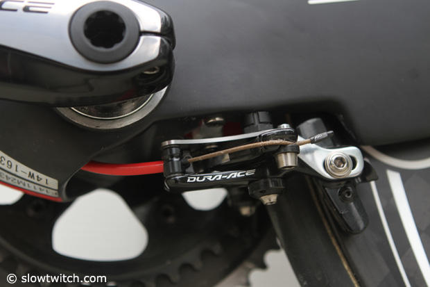 The rear brake is hidden below the chainstays and can also be replaced with a single bolt one. The one currently in place is too wide to allow Millward to use his Stages power meter.