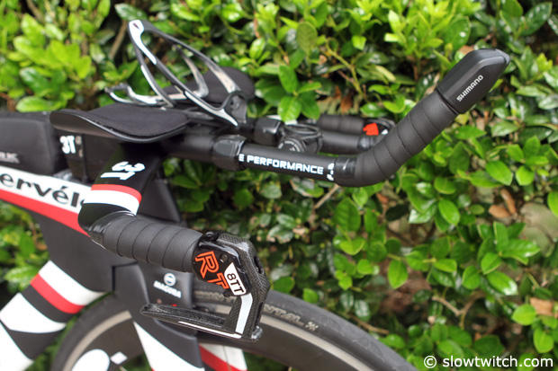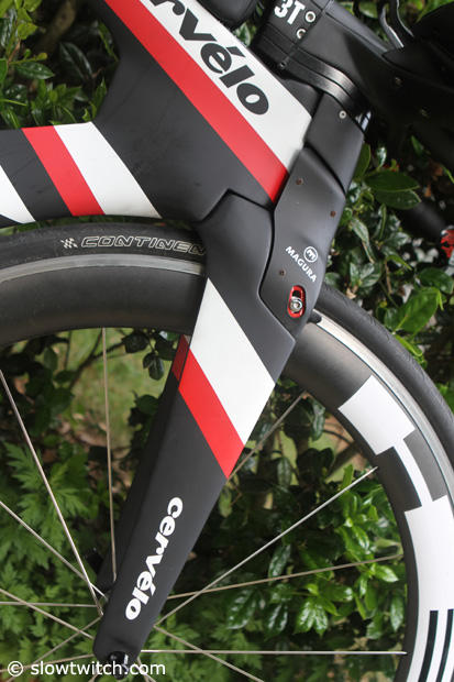Up close with the distinctive front end of the Cervelo P5/6 of Amy Marsh.