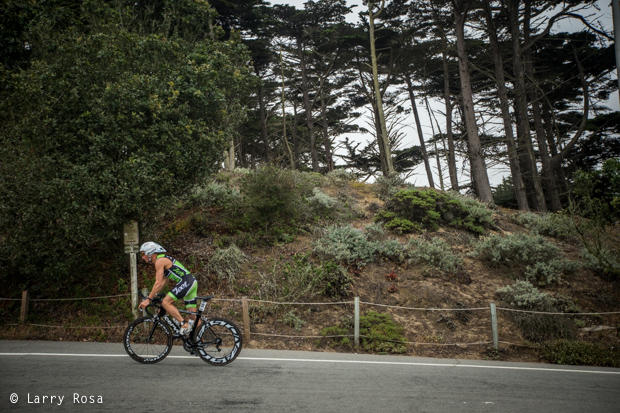Nothing is easy on the Escape From Alcatraz course. Here Shane Arters pushes up a climb on the way to 1st place in M45-49.