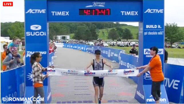 At the finish, he told Ironman Live, “I’m so tired. That was one of the hardest things I have done in my life. When I was speed skating, my races were 40 seconds, not 5 hours. Ten minutes into the swim, I was dead. I think I went too hard, I just got excited.”