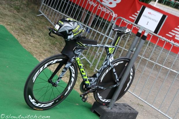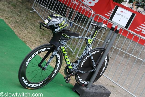 The Scott Plasma of 70.3 World Champion Sebastian Kienle had hidden brakes front and back, and a few other interesting details including a nifty paint scheme. This bike parked in transition at the 2014 Challenge Kraichgau however is quite different in many ways when compared to Luke McKenzie's Scott Plasma 3 race bike in Kona. Is it a cleverly covered prototype of a new bike to come from Scott?