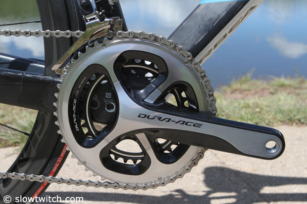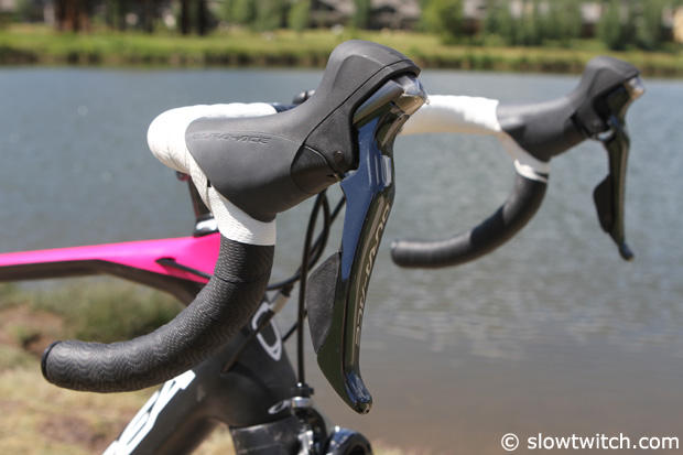 Two tone bare tape and mechanical Shimano Dura-Ace shifting on an FSA cockpit.