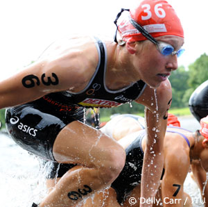 On a cold, rainy and rare Friday start, 2012 Olympic champion Nicola Spirig remained calm after emerging from the swim 10th, 56 seconds behind leader Sara Vilic of Austria and nearly a minute behind the dangerous Rachel Klamer of the Netherlands. In a pouring rain, Spirig charged hard, working with Lisa Perterer on the bike to close the 1 minute gap on the leaders. On the run, Spirig took advantage of the fitness she displayed with a 2:42:54 marathon in April to survive some last lap cramps and post a tied-for-race-best 36:19 run split to finish in 2:10:24 with a 16 second margin over Saller.