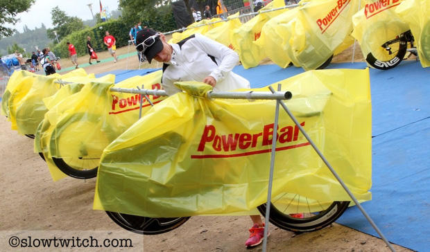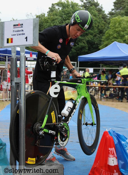 The bike of Ironman World Champion Frederik Van Lierde before the plastic cover hides it from view.