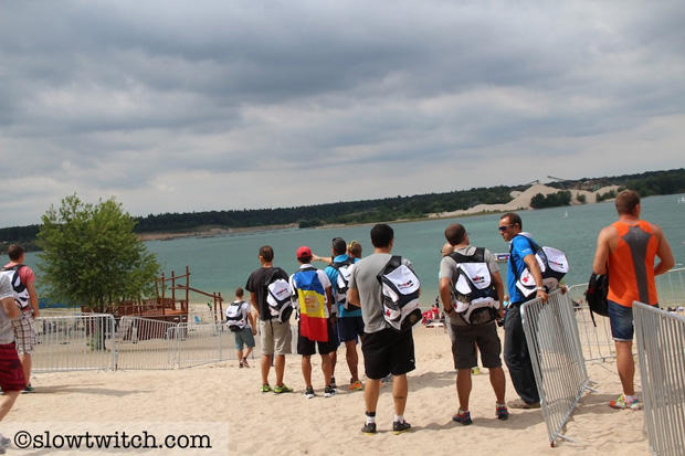 Athletes who checked in their bikes now have a closer look at the Langener Waldsee where they will swim 2 loops tomorrow.