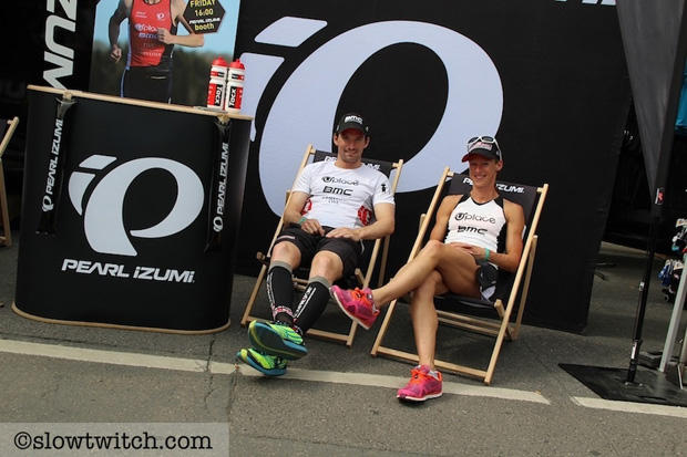 Team Uplace-BMC athletes Ronnie Schildknecht and Corinne Abraham spending time in the expo for sponsor Pearl Izumi.