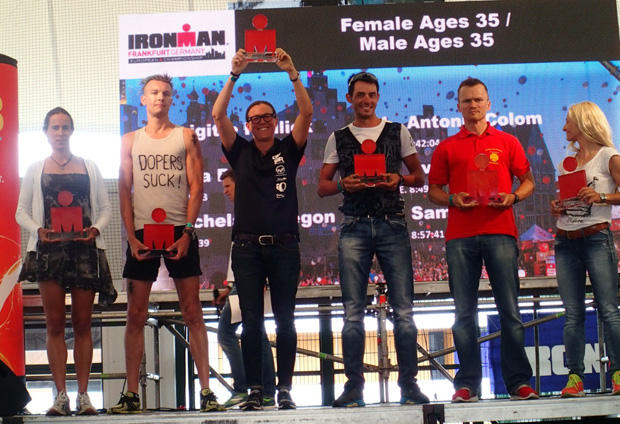 When he was called up on stage at the Ironman European Championships awards, Sam Gyde sported a Dopers Suck shirt to protest age group winner Antonio Colom – a former road cyclist who was banned for doping from 2009-2011. It was a last minute decision for this fast Belgian, and thus the cobbled look of that shirt, but it was a statement that quickly spread throughout the triathlon world.