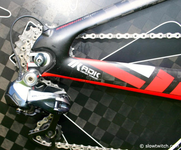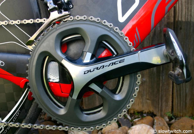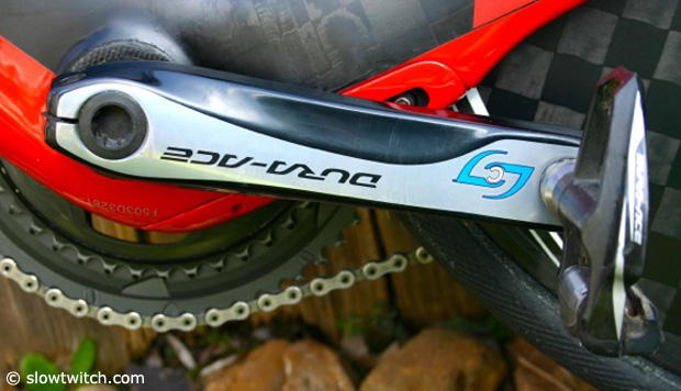 Tim Reed has 165mm Shimano Dura-Ace cranks with Atomic Performance coated chainrings. And yes there is a power meter.