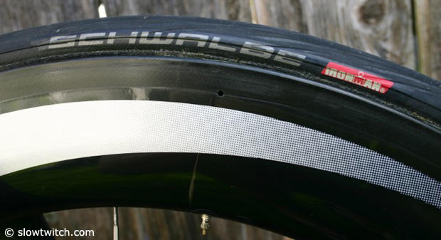 Reed has a Schwalbe Ironman 22mm tire up front on a Shimano Pro C75 tubular wheel.
