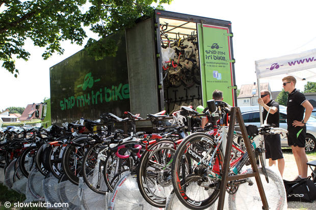 The setup of the Ship My Tri Bike group from Ireland. The 18 ton rig is nicely fitted with wall mounts to safely transport the bikes. The crew also carried large duffle bags for their customers on that truck.