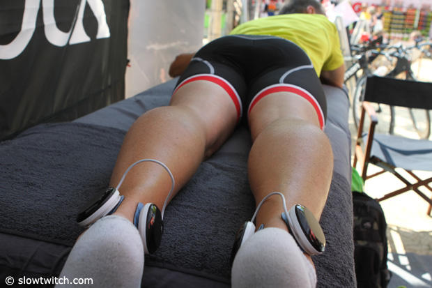 An athlete experienced the Compex wireless unit in the expo, and he seemed very relaxed.