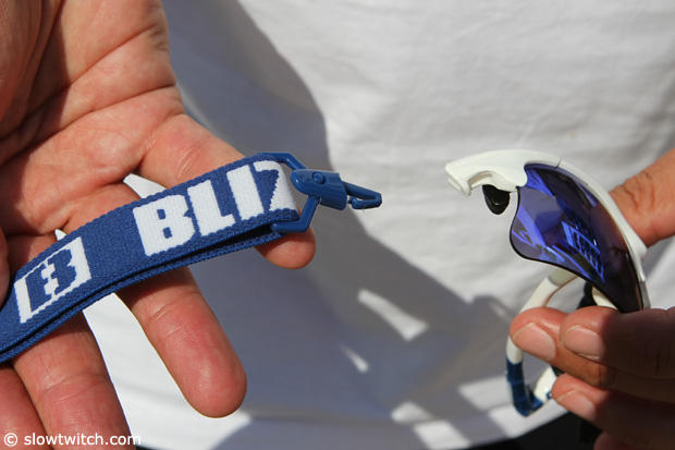 The Swedish brand Bliz, that is apparently popular with cross country skiers and biathletes features removable temples that can be smoothly replaced with a head band for more extreme sports. During Challenge Roth the Pursuit XT model can be had for Euro 69 with 2 lenses, the head band, and a brow sweat strip, plus a case.