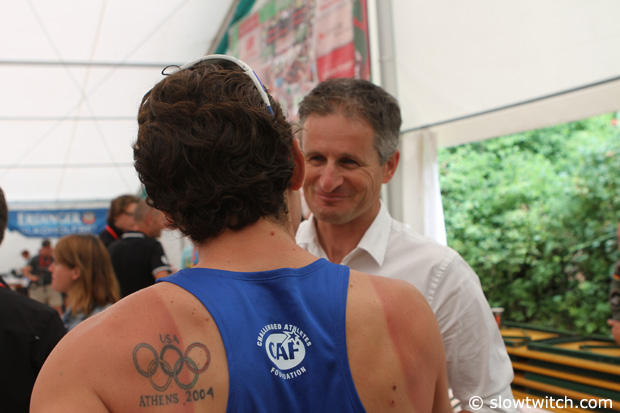 Zibi Szlufcik of the Challenge group shares a laugh with Rudy Garcia-Tolson who shows signs from Sunday's hot event.