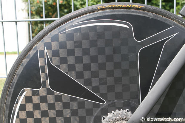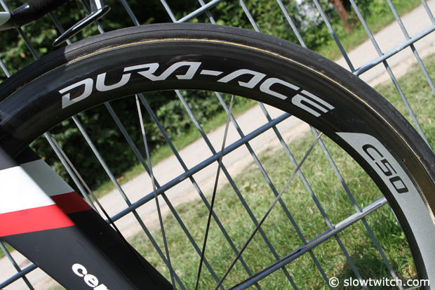 A Shimano Pro C50 wheel up front with Continental tires front and back and CeramicSpeed bearings.