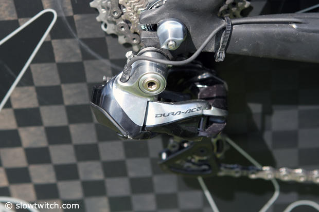 Rachel Joyce's pulleys are CeramicSpeed Titanium 11 speed pulley wheels in place of the stock Shimano pulleys of this Dura-Ace D12 derailleur.