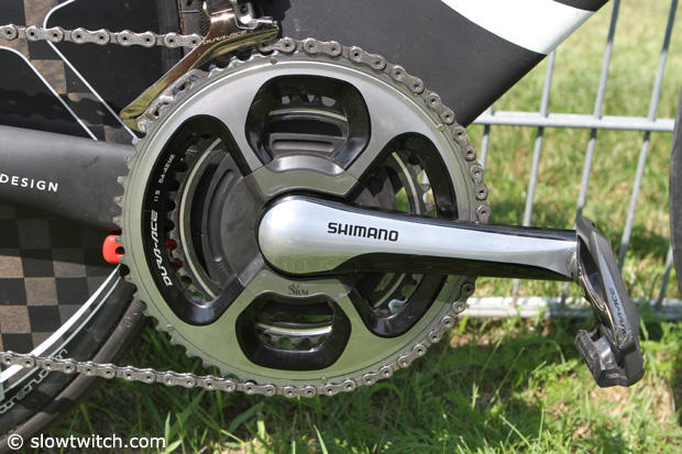 An SRM power meter on a Dura-Ace crank with Shimano Dura-Ace pedals. Joyce also has a CeramicSpeed Bbright PF4624 bottom bracket system that is compatible with Shimano 24mm crank axles without adapters or converters.