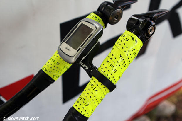 The neon yellow Fizik bar tape matches the bike nicely, and McKenzie relies on a Garmin 500 for information.