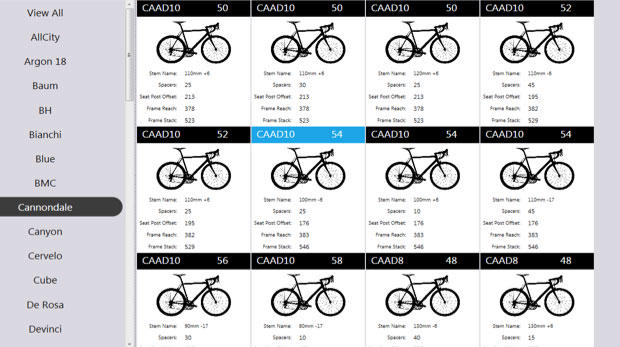 The third part of a Retul report – using its Frame Finder software – is the matching of these fit coordinates to complete bike solutions. Very granular solutions: frame model, size, and front end set-up. Only X/Y-based systems can give you this.