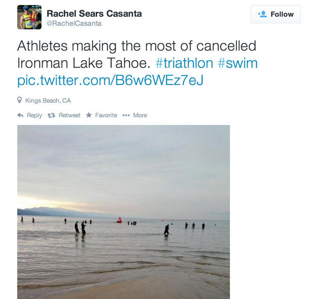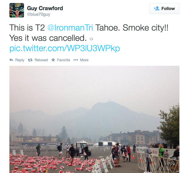 "Bummed 2 not race today @IronmanTri Tahoe but clearly the right call was made 4 athlete safety.Now to get head round a flight to Chattanooga." said Matt Lieto @mattlieto