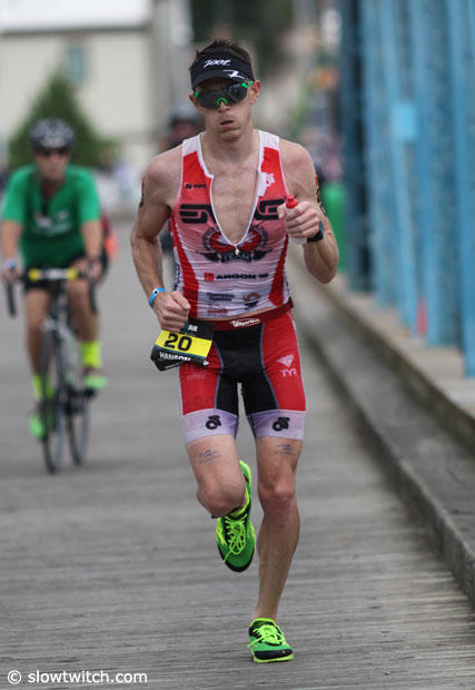 Limkemann pulled away from Brandon and was alone up front for the remainder of the 116 mile bike segment. Around 20 athletes were in the chase pack behind Limkemann, but they did not manage to pull time back. German Per Bittner tried to jump across to Limkemann but ended stuck in the middle, and before too long he was swallowed up again by the group who appeared to be riding fair and correctly spaced. During the second loop as the Pros started to lap age groupers, a few folks dropped out from that group and fell back, and among them was Brandon. Pedro Gomes reportedly hit the deck hard with only a few miles left to go and ended up pulling out and in need of medical attention. Limkemann reached the bike-run transition first with a race best 4:34:16 bike split, and that gave him a 5 minute plus advantage over Trevor Wurtele who pulled away late from that group.