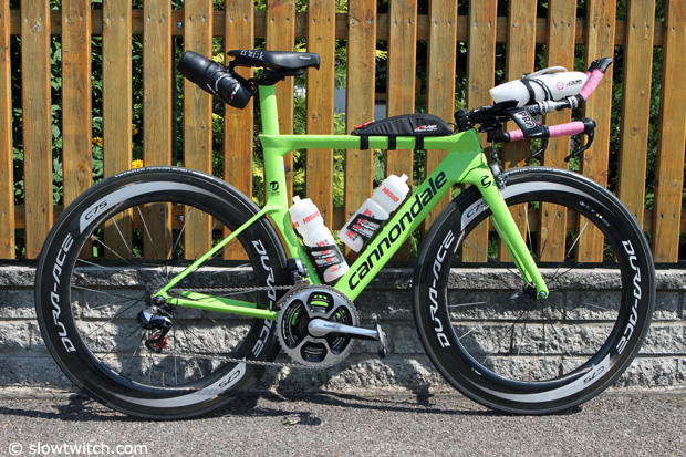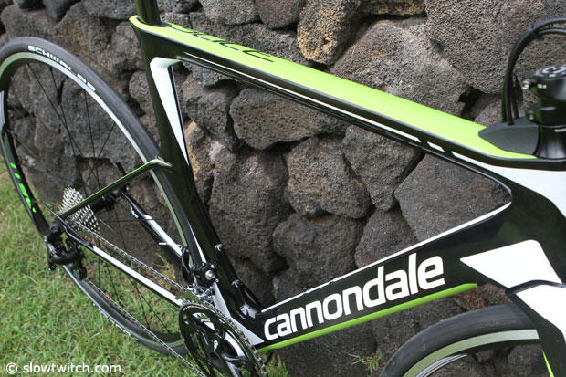 I immediately liked this bike when I first saw it in Roth, Germany in early July where a bright green one was piloted by Michelle Vesterby. I thought that the crew at Cannondale was on to something here, but it won't make everyone happy and Cannondale is aware of this. Instead of going full throttle down the aero path they decided on a balanced approach to triathlon performance, and focused on combining solid aerodynamics with ultra light weight, comfort, fit, handling and ease of use. And according to Cannondale designer Murray Washburn "A combination that will be of more use to real triathletes in the real world than small gains in pure aerodynamics."