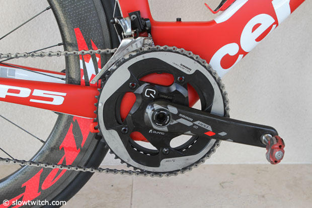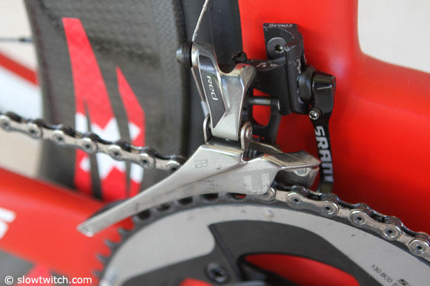 SRAM Red derailleurs front and back, and a SRAM guide prevents chain dropping.