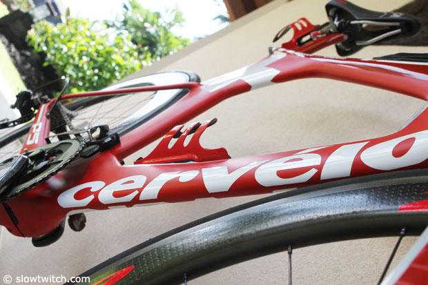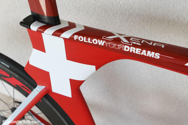 Caroline Steffen rides a 56cm Cervelo P5 and the paint scheme came from Cervelo graphic designer Tom Briggs.