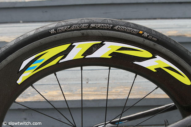 A Zipp 808 in the back with a 23 mm Continental Grand Prix 4000 S.