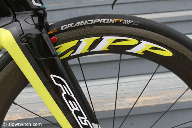 Mirinda rides a 23mm Continental GrandPrix TT up front on a Zipp 404.