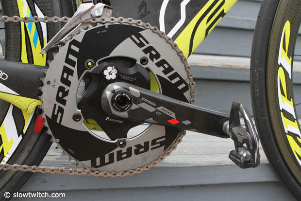 Rinny rides 165 SRAM red cranks with a Quarq power meter.