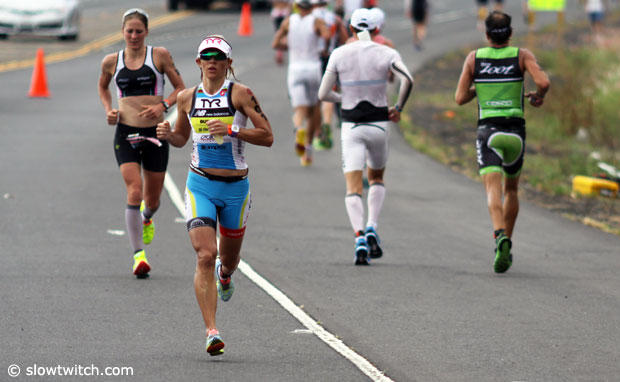 then chipped past six rivals like a hungry Pac Man until only Ryf was left. Sure enough approaching the 23 mile mark, Carfrae cruised past Ryf with a friendly but brief word of congratulations then cruised to the finish with a 2:50:26 marathon that broke her 2013 record by 12 seconds and gave her a 2:02 margin of victory over the amazing Swiss whose career was given a boost this year by coach Brett Sutton.